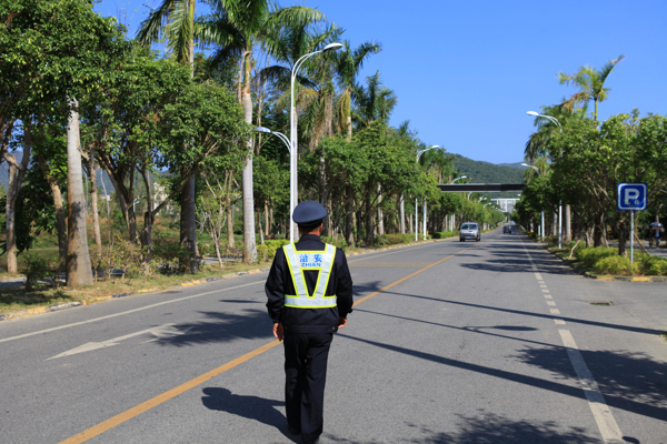 治安工作人员正在学府大道上执勤,不时提醒过往车辆慢速行驶,为师生安全离校、安全度假提供保障。
