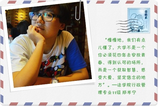 对于那些事与愿违的事情我不再那么心存执念,让我不禁想到《谁的大学不迷茫》里的一段话:“慢慢地,我们有点懂了,大学不是一个你必须花四年去安放青春、得到认可地场所,而是一个获取智慧、感受大爱、坚定信念地地方”。这段话,与大家共勉。