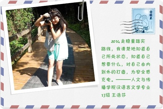 愿或不愿,新学期已款款而至,不紧不慢;见或不见,同学们都开启奋斗模式,不声不响。2014 ,走稳重踏实路线,我清楚地知道自己所处状态的优势和不足,知道自己想要什么,对自己由内到外地打造,为安全感充电。
