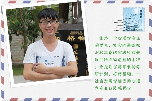 在学业的准备上,作为一个心理学专业的学生,扎实的基础知识和丰富的实践经验是我们所必须达到的水准。这也是为了将来我的考研计划打好基础。这学期,我加入的“力比多”心理实验小组,也准备开始一系列的心理实验。小组内,大家将开始讨论,策划,实施,总结,从而独立完成一次足以写出论文的心理实验,并争取投稿国内一些学术杂志,向我们的学长学姐看齐。这也能为将来考研创造一个有力的竞争条件。