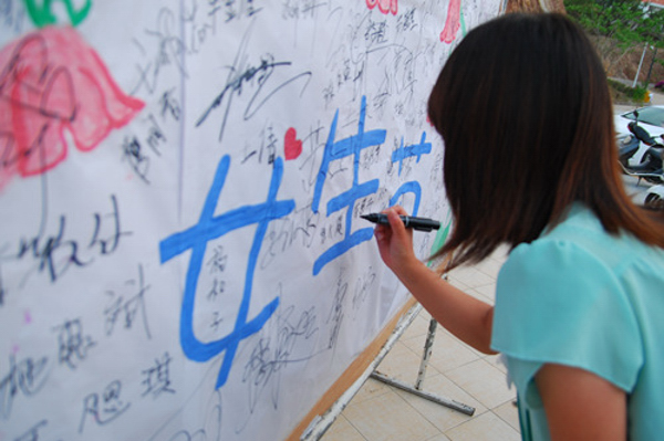 3月7日一大清早校园中就挂上了一幅幅关怀女生的横幅,每一条横幅中的标语都充满着趣味和温暖。与此同时,各学院学生会还组织了各式各样的关怀女生活动。在我校南区广场上挂满了写有女生心愿的彩色卡片,再由男生取下感兴趣的卡片,主动完成卡片上女生的小心愿。更有“心愿墙”送礼品、食堂门口送鲜花等活动,让全校女生都感受到了男生们贴心的关怀。