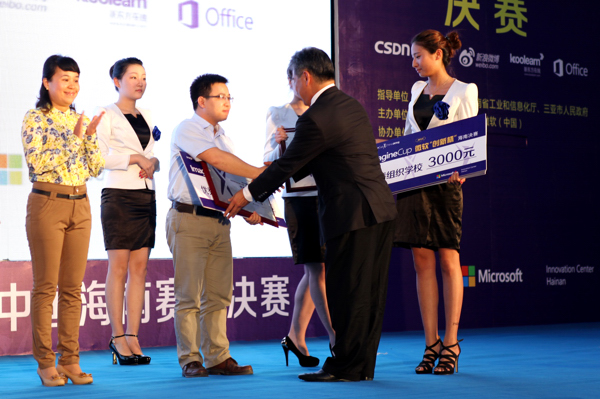 我校获颁“优秀组织学校”奖,图为我校理工学院副院长周密正在接受海南微软创新中心董事长佘永旭的颁奖。