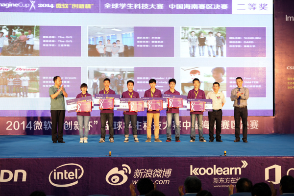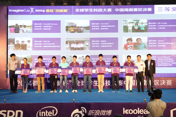 比创意,比实践,比最终的呈现。经过两天的激烈比拼,4月11日下午3时,imagine cup 2014微软“创新杯”全球学生大赛海南赛区决赛闭幕式暨颁奖典礼在我校千人礼堂举行。海南工业及信息化厅信息产业处处长曹世平、海南工业及信息化厅信息产业处副处长姜伟、海南省教育厅高等教育处副调研员邓昌清、微软大中华区首席技术官 sandy gupta、海南微软创新中心董事长佘永旭、总经理李科研、微软(台湾)dpe总经理刘念臻、国立中山大学咨询管理学系教授林信慧博士、微软(中国)dpe技术顾问总监夏鹏、微软(中国)dpe技术顾问经理周闻钧、海南微软创新中心技术总监周弋钦、imagine cup微软”创新杯”2011年全球嵌入式开发组冠军台湾团队等出席闭幕式。我校党委书记、校长陆丹致闭幕词。来自我校理工学院软件工程1101班的“水帘洞”团队与the gift团队获得本次大赛二等奖,oh code团队获得本次大赛三等奖,他们分别获得了微软提供的2500元和1500元的创新基金。