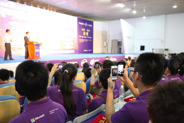 来自海南各个高校18支团队的参赛选手们正在用手机记录下在我校难忘的比赛经历