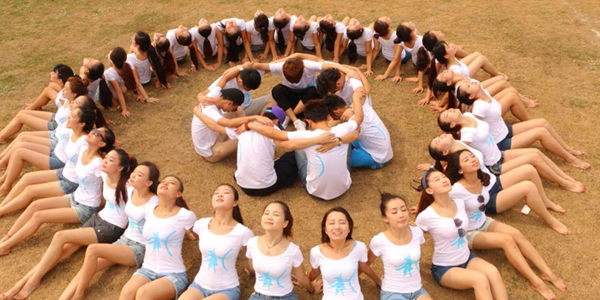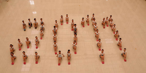 白t恤、蓝热裤、小红鞋,全班41人齐刷刷抱膝而坐,摆出形为阿拉伯数字“2011”的人形图,青春靓丽、吸引眼球、美不胜收。