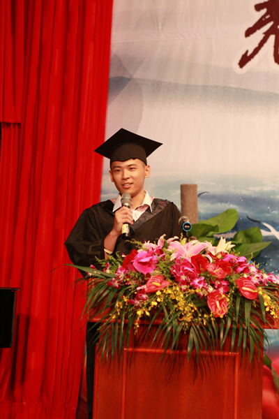 优秀毕业生贺文龙代表全体毕业生送上对母校最诚挚的感谢 优秀毕业生代表、旅业管理学院邮轮管理与服务1001班的贺文龙代表全体毕业生送上对母校最诚挚的感谢,如数家珍大学里经历的点点滴滴,誓言要用激情、智慧、勇敢、求索的心,在社会上建功立业,成为令母校骄傲的优秀学子。