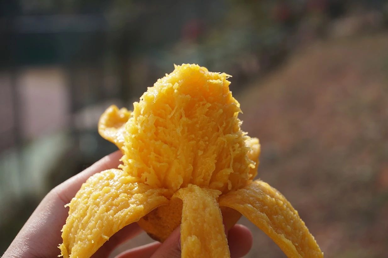 打开的时候可以把皮直接从芒果尖尖撕到尾