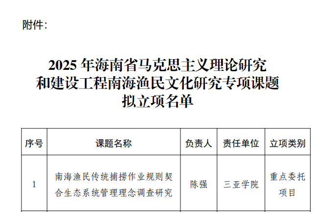 近日,海南省马克思主义理论研究和建设工程专项课题管理办公室发布《关于2025年海南省马克思主义理论研究和建设工程南海渔民文化研究专项课题拟立项名单的公示》,我校社会学院陈强教授申报的“南海渔民传统捕捞作业规则契合生态系统管理理念调查研究”获批为重点委托项目,资助经费10万元。该课题通过深入挖掘南海渔民传统捕捞作业方式和理念的文化与生态双重价值,研究其中蕴含的生态文明智慧,以及对现代生态系统管理的理论和实践价值,阐发其对构建海洋命运共同体的贡献和意义,通过综合运用多学科、跨学科话语开展体系化、学理化阐释。近年来,陈强教授专注于南海航海史和南海渔民文化研究,其成果在相关领域产生一定影响力。