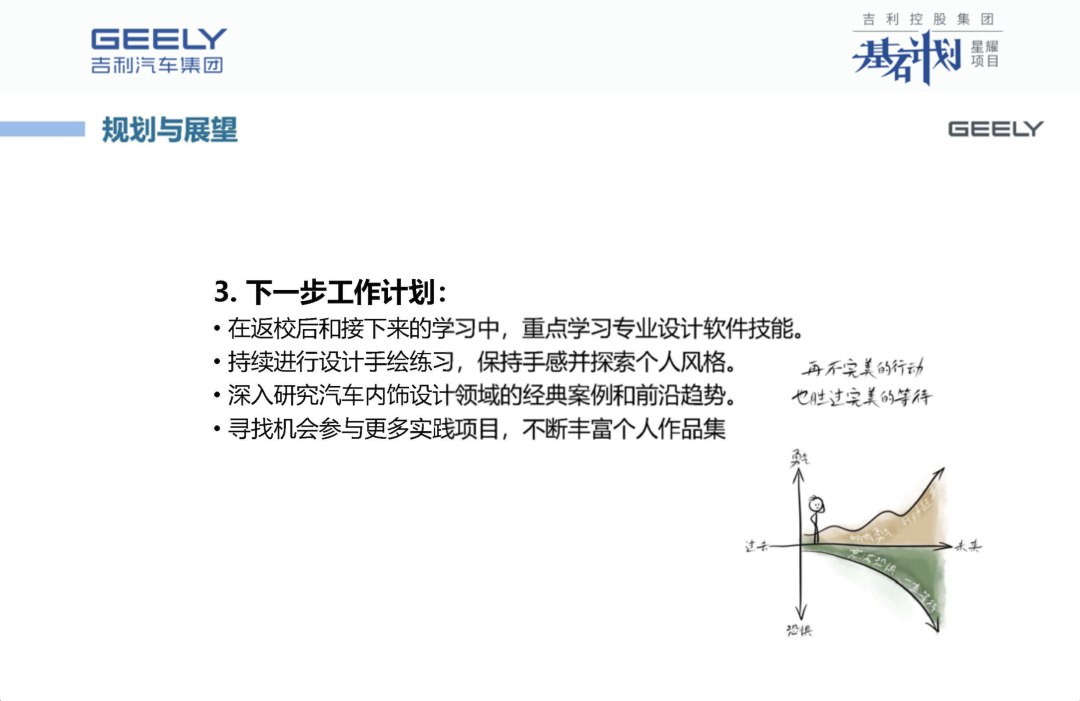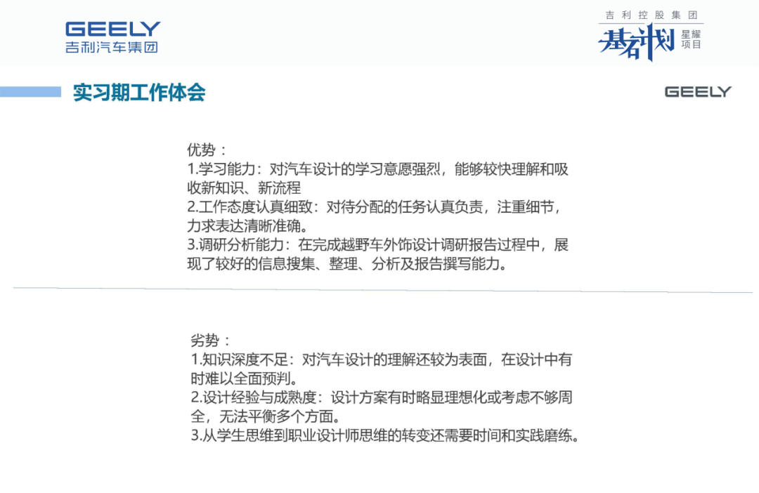 这次实习让我接触到真实项目,与一线设计师交流,深刻体会到设计是始于问题、忠于落地、将创意转化为产品的过程。我认识到自身不足,未来将继续深入学习,提升设计认知与技能,为成为一名合格汽车设计师并加入吉利不断努力。