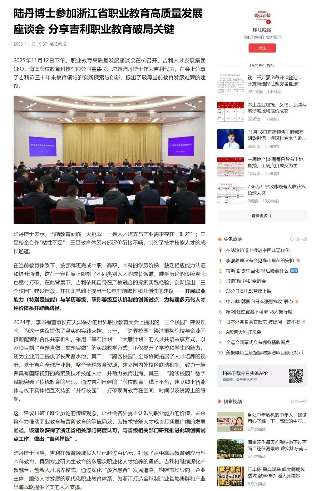 2025年11月12日下午,职业教育高质量发展座谈会在杭召开。吉利人才发展集团CEO,海南芯位教育科技有限公司董事长、总裁陆丹博士作为吉利代表,在会上分享了吉利近三十年来教育领域的实践探索与创新,提出了破局当前教育发展难题的建议。