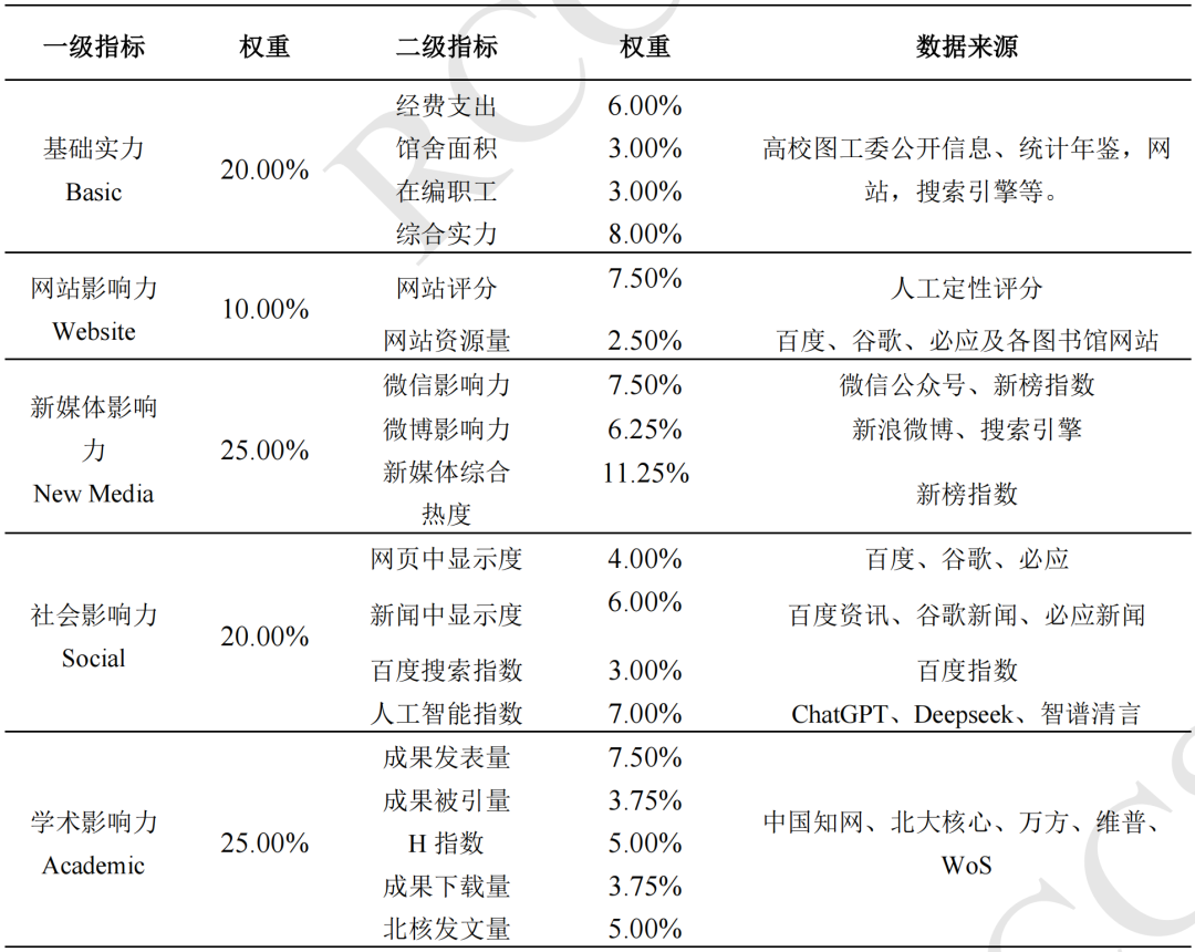 《数智时代中国图书馆影响力指数报告(2025版)》秉承“分类评价、同类比较”原则,根据数智时代图书馆影响力的构成,基于“基础实力、网站影响力、新媒体影响力、社会影响力、学术影响力”五维一体的评估模型,通过多源数据采集、多轮人工校验与交叉检验,对全国2919所高校图书馆、1980所公共图书馆及390所专业图书馆进行了系统评估。报告在数据获取、指标构建与结果分析中,坚持公开、透明、稳健的方法,具有较高的科学性、可比性、权威性与参考价值。