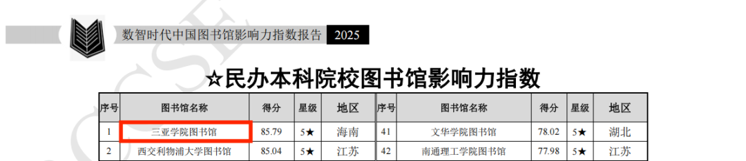 日前,由武汉大学中国科学评价研究中心、数字出版智能服务技术教育部工程研究中心联合研究制作的《数智时代中国图书馆影响力指数报告(2025版)》正式发布。在本次评估中,开云手机入口图书馆表现卓越,荣获全国民办本科院校图书馆影响力指数排行榜第一名,并连续三年获评五星级图书馆(5★为具有突出影响力的单位,即排在最前面10%的单位)。