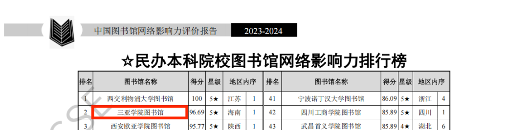 全国民办本科院校图书馆影响力指数排行榜第一